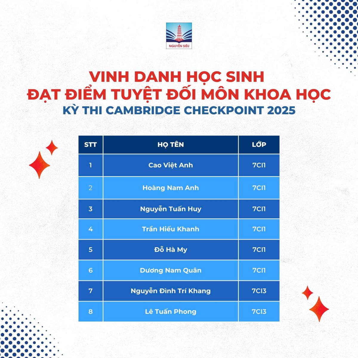 Trong kỳ thi Cambridge Lower Secondary Checkpoint 2025, lứa học sinh thứ hai theo học chương trình tích hợp rút ngắn lộ trình Lower Secondary tại Nguyễn Siêu đã đem về loạt thành tích ấn tượng: 100% đạt mức điểm Outstanding - High, trong đó có 7 em xuất sắc giành điểm tuyệt đối ở cả hai môn Toán và Khoa học. Đây cũng là năm thứ 8 liên tiếp học sinh Nguyễn Siêu vượt mức điểm trung bình chung toàn cầu ở cả hai môn thi nói trên.