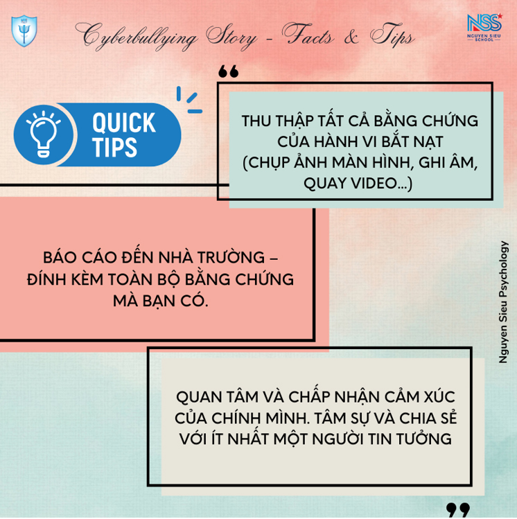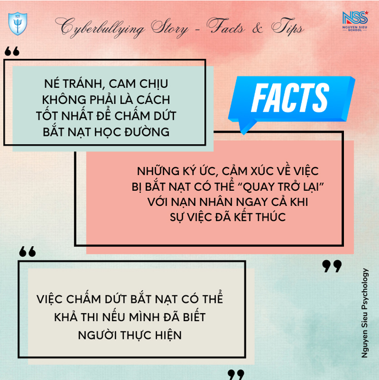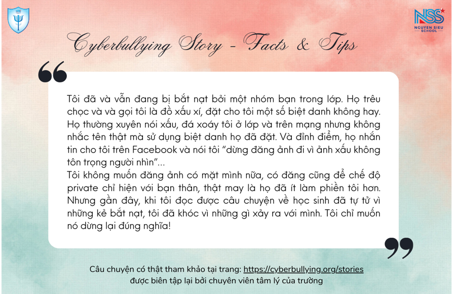 👌 Hy vọng Series “Cyberbullying stories - Facts & Tips” này sẽ giúp NSers có góc nhìn thực tế về bắt nạt học đường và biết cách để đương đầu với từng vấn đề cụ thể.