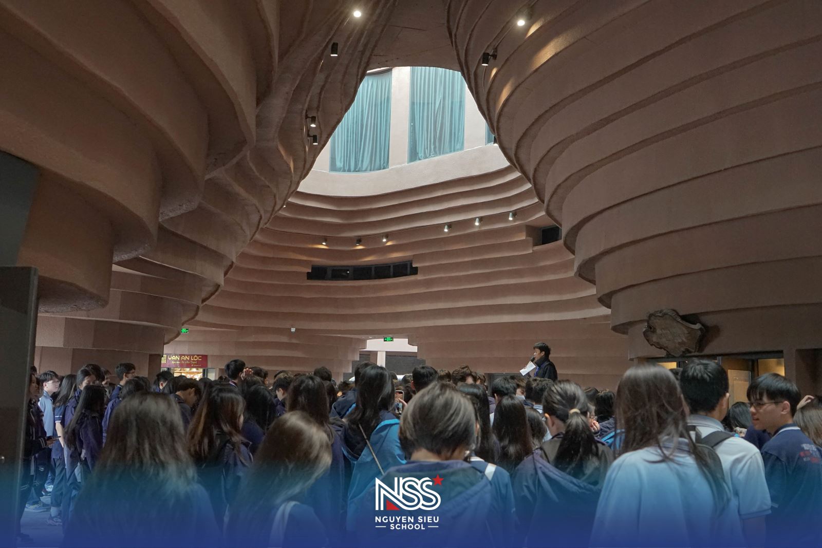 Sau khi được các anh chị hướng dẫn đoàn giới thiệu về lịch sử hình thàng làng và quá trình xây dựng Bảo tàng, học sinh khối 9 được chia thành 4 nhóm. Các bạn di chuyển đi tham quan các tầng của khu vực "Trụ Bàn Xoay" vốn được đặt theo tên của bàn xoay nặn gốm - vật dụng không thể thiếu đối với người nghệ nhân Bát Tràng.