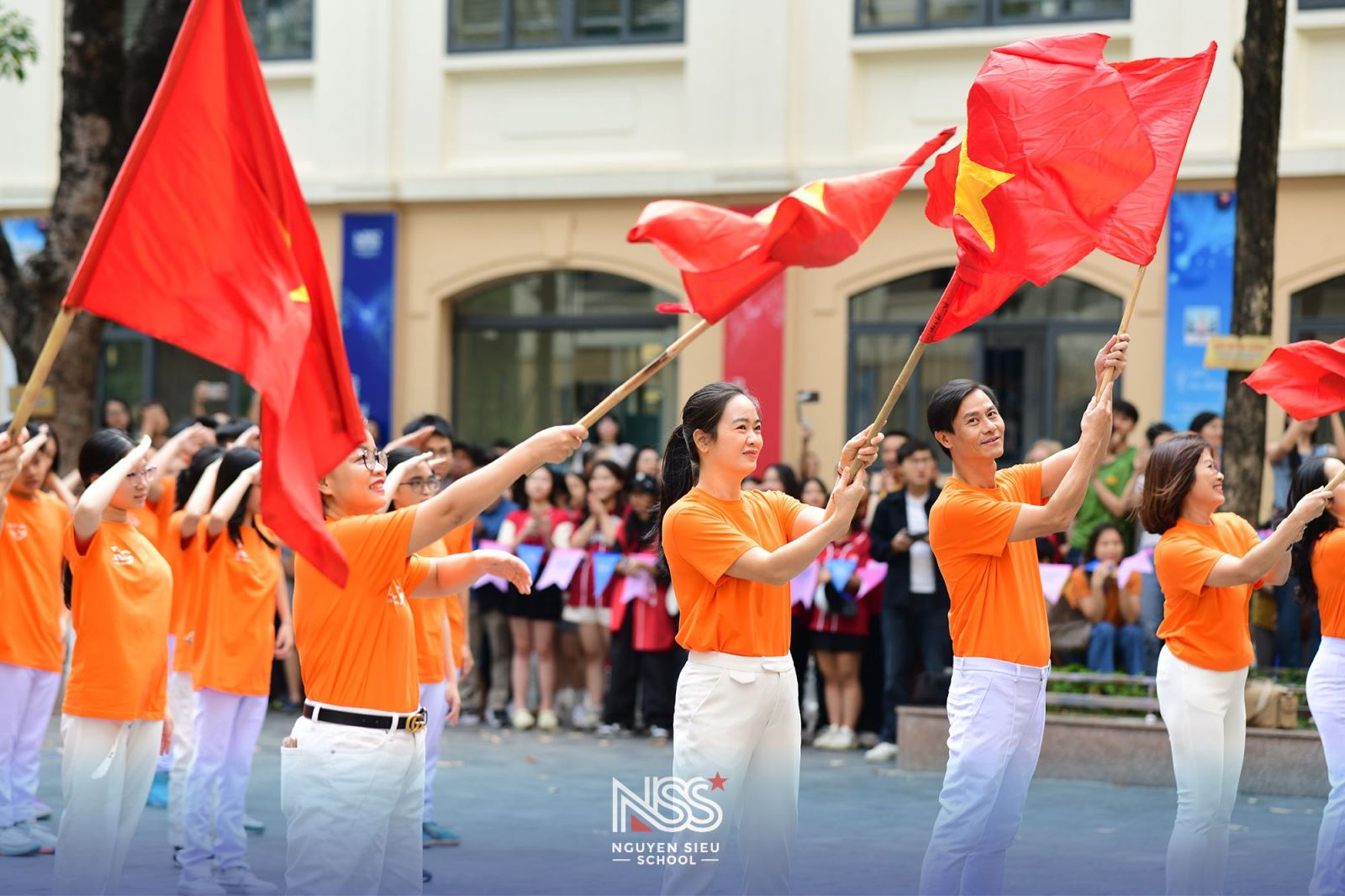 Ngay từ sáng sớm, sân trường đã ngập tràn các sắc màu đồng phục: đỏ, xanh, vàng, tím… Mỗi khối lớp có riêng cho mình một màu nhận diện thể hiện rõ tinh thần đoàn kết đồng lòng.