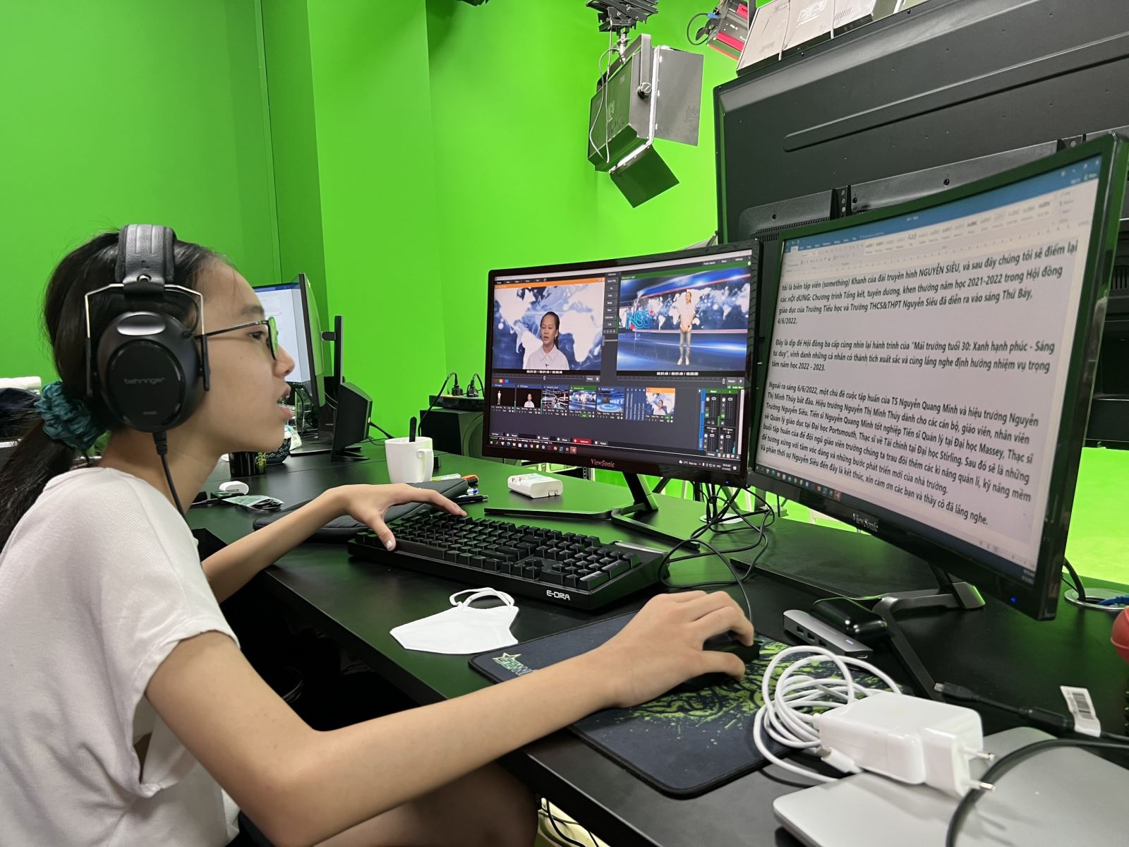 Các bạn học sinh hào hứng tham gia học lý thuyết và trải nghiệm thực tế sử dụng máy ảnh, máy quay, thiết bị dựng phim tại studio.