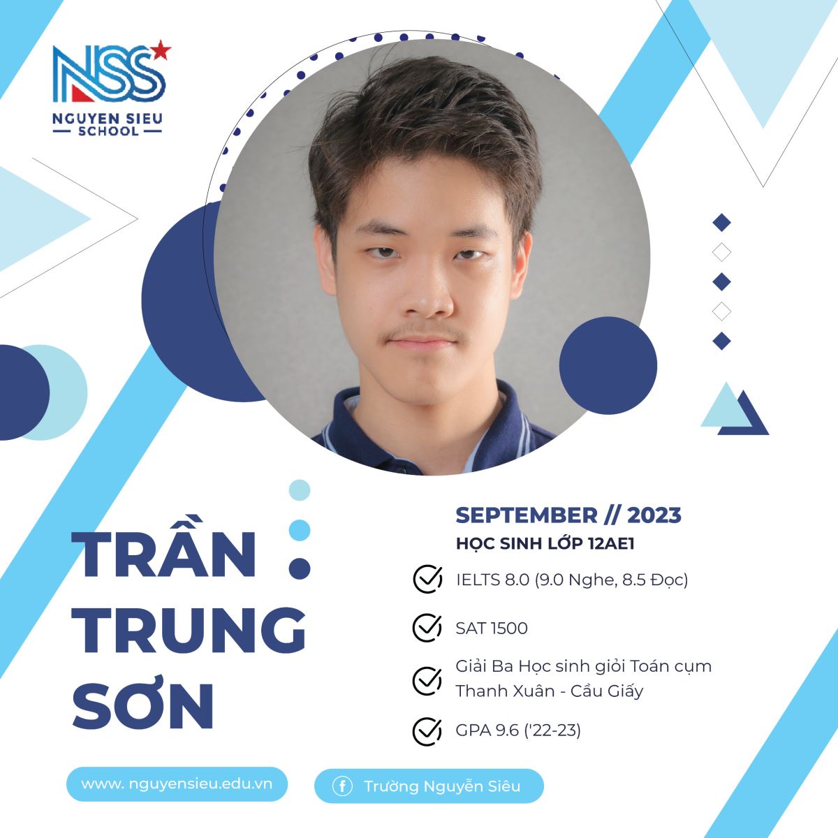 Lớp trưởng 12AE1 Trần Trung Sơn đã dành cả 12 năm hoa niên học tập dưới mái trường Nguyễn Siêu. Trước khi gia nhập Top 3% thế giới trong các kỳ thi chuẩn hóa quốc tế mới đây, Sơn đã đạt giải Ba môn Toán Kỳ thi Olympic học sinh giỏi các môn văn hoá cụm Thanh Xuân - Cầu Giấy, sở hữu GPA “khủng” 9.6.