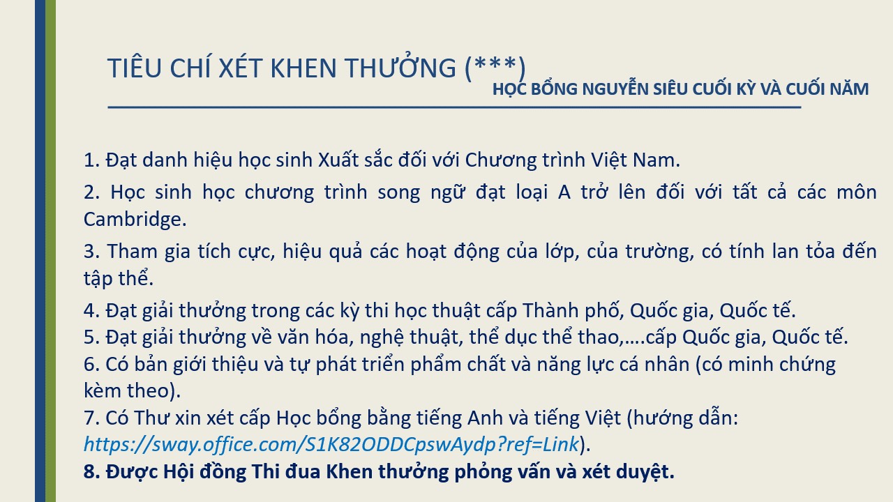 * Nguyễn Ngọc Bảo: ĐTB HK1: 9.8; 100% điểm A* các môn Cambridge; Huy chương Vàng kỳ thi E-NNOVATE tháng 4/2021; Giải Khuyến khích kỳ thi Genius Olympiad; IELTS: 7,5; AP: Calculus, Statistic: 5/5