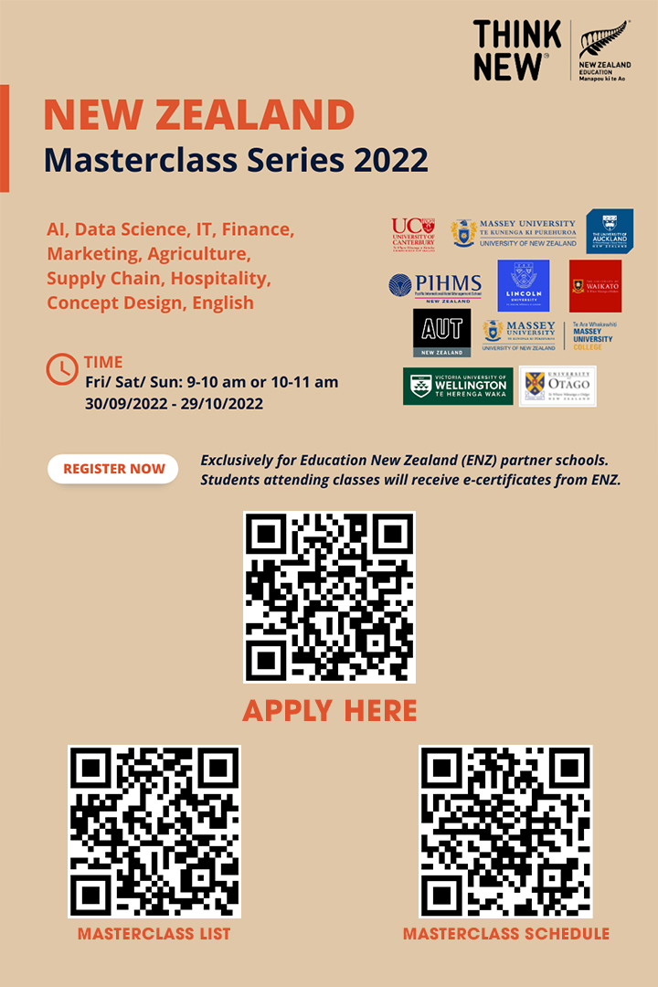 Trong tháng 9 và tháng 10 này, Tổ chức Giáo dục New Zealand (ENZ) sẽ tổ chức chuỗi Master Class miễn phí cho học sinh từ khối 10 đến khối 12, diễn ra vào sáng thứ 6, thứ 7 và Chủ nhật hàng tuần. Sau khi tham gia khóa học, học sinh sẽ được nhận chứng chỉ do ENZ cấp. Hạn đăng kí cuối 21/9/2022.