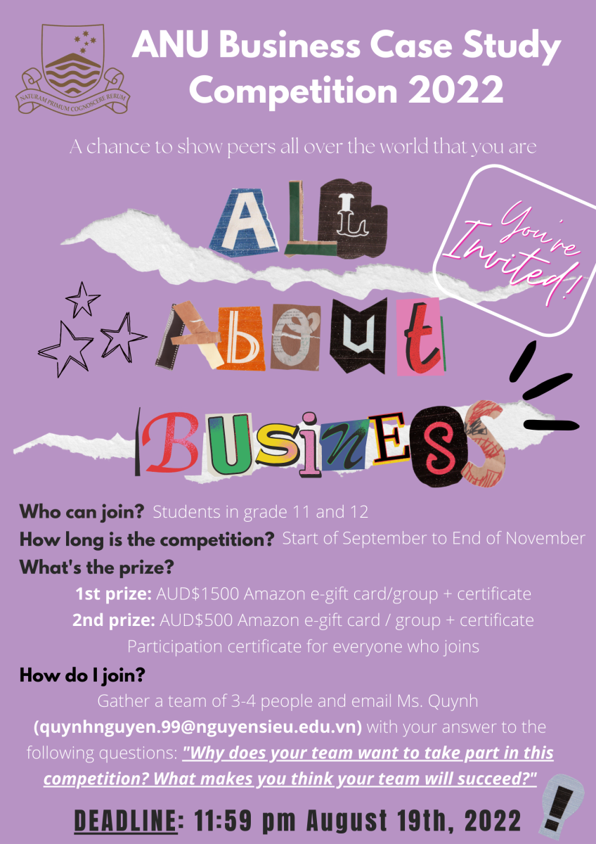 Cuộc thi ANU Business Case Study Competition 2022 dành cho các đội học sinh lớp 11 và lớp 12 nhằm thể hiện kĩ năng phân tích, xử lý tình huống, giải quyết vấn đề và tăng kĩ năng giao tiếp, làm việc nhóm. Đây là cơ hội tuyệt vời để các bạn học sinh trung học thể hiện những hiểu biết về phân tích và kĩ năng trình bày trong lĩnh vực thông tin tài chính, quản trị doanh nghiệp; cũng như đề xuất các quyết định hiệu quả, linh động trong môi trường kinh doanh. Không những vậy, học sinh còn được thỏa mãn đam mê kinh doanh và quản lí doanh nghiệp; được trải nghiệm cũng như thể hiện bản thân trong môi trường chuyên nghiệp, trẻ trung.