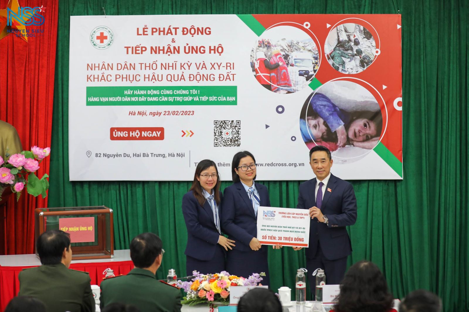 Với truyền thống đoàn kết, tương thân tương ái, đồng thời hưởng ứng lời kêu gọi của Hiệp hội Chữ thập đỏ và Trăng lưỡi liềm đỏ quốc tế, ngày 23/02/2023, trường Nguyễn Siêu đã trực tiếp tham gia Lễ phát động và tiếp nhận ủng hộ nhân dân Thổ Nhĩ Kỳ và Xy-ri tại Trung ương Hội Chữ thập đỏ Việt Nam, số 82 Nguyễn Du, Hà Nội và quyết định ủng hộ 30 triệu đồng tới người dân Thổ Nhĩ Kỳ và Xy-ri. Số tiền này được trích từ quỹ “Ước mơ Xanh” – một thành tố của quỹ Từ thiện – Xã hội chung toàn trường.