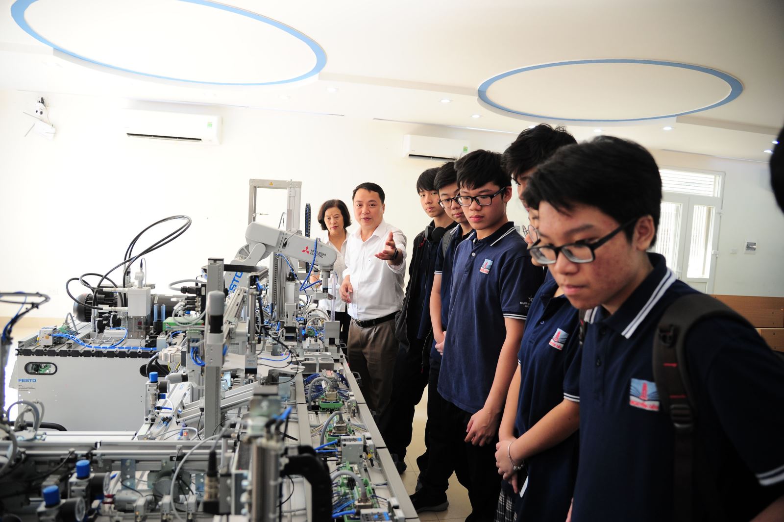 Đến trường Cao đẳng Cơ điện Hà Nội, học sinh Nguyễn Siêu đã được tận mắt chứng kiến dây chuyền vận hành của cánh tay robot tự động, hệ thống đóng gói sản phẩm tự động, phòng thực hành lập trình robot trí tuệ nhân tạo...