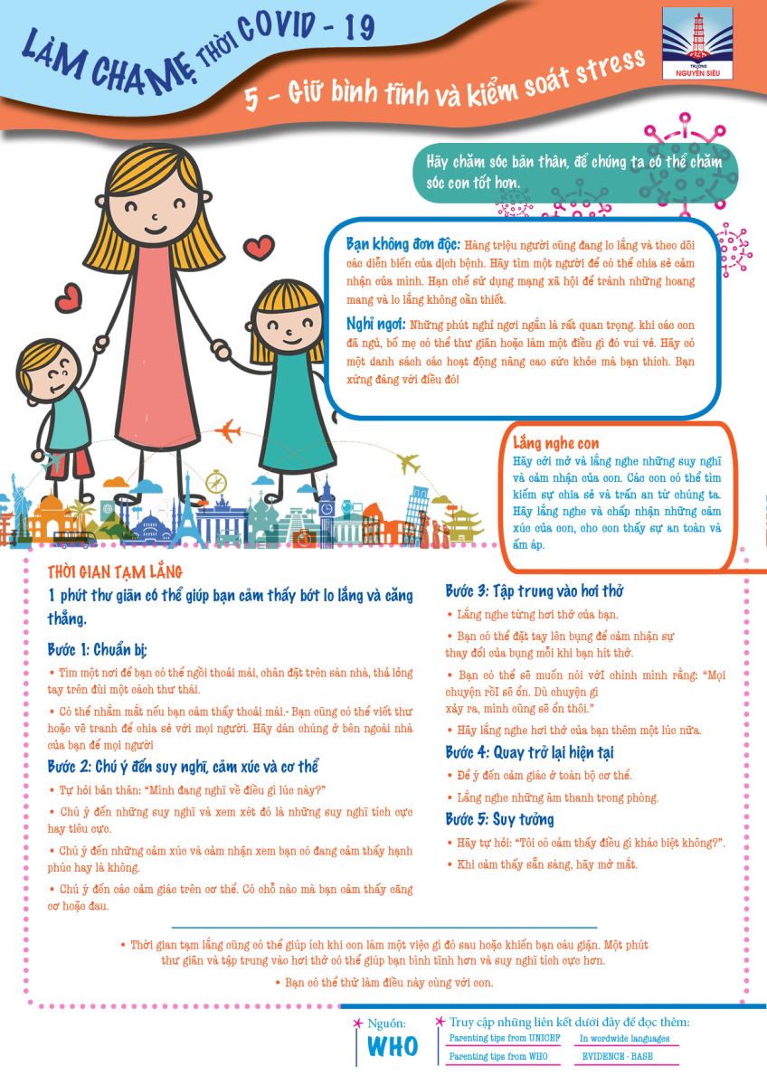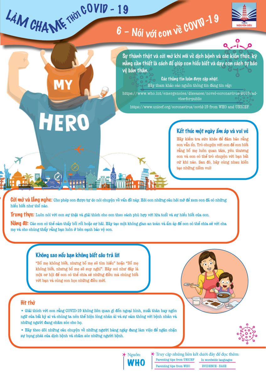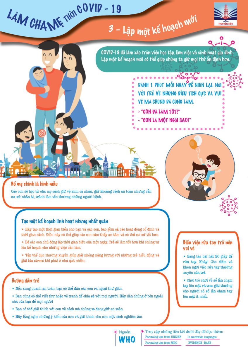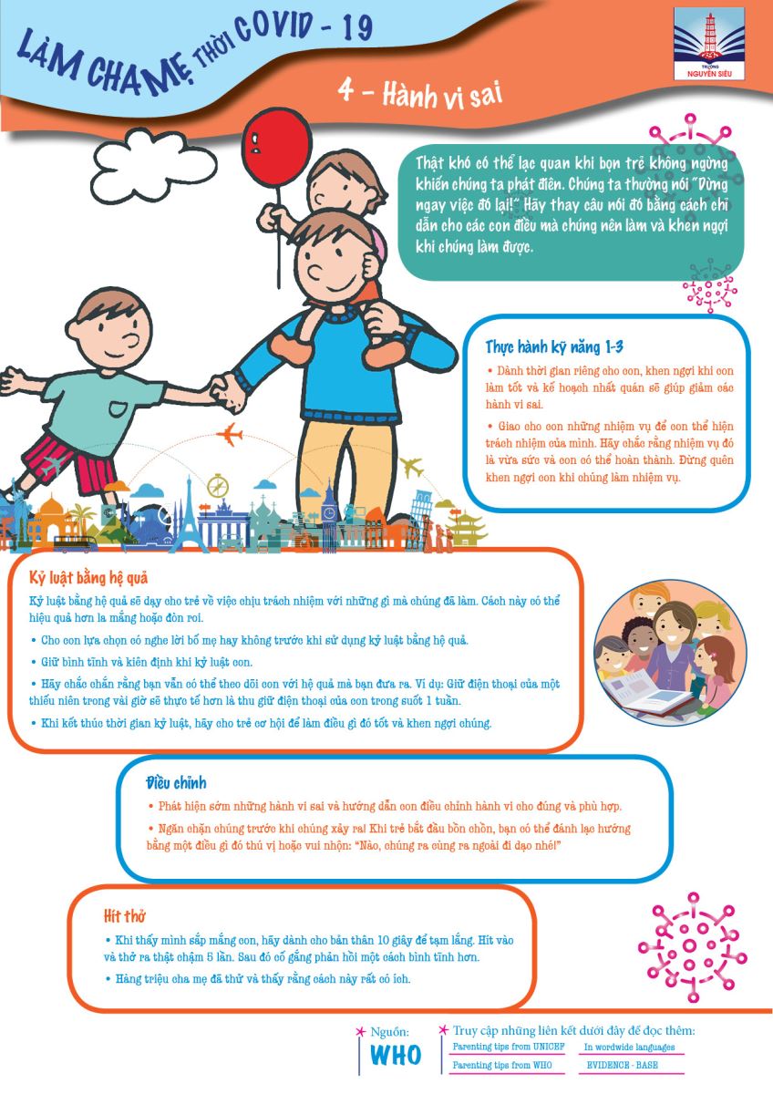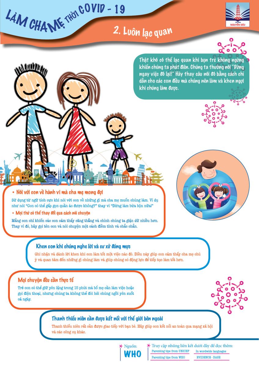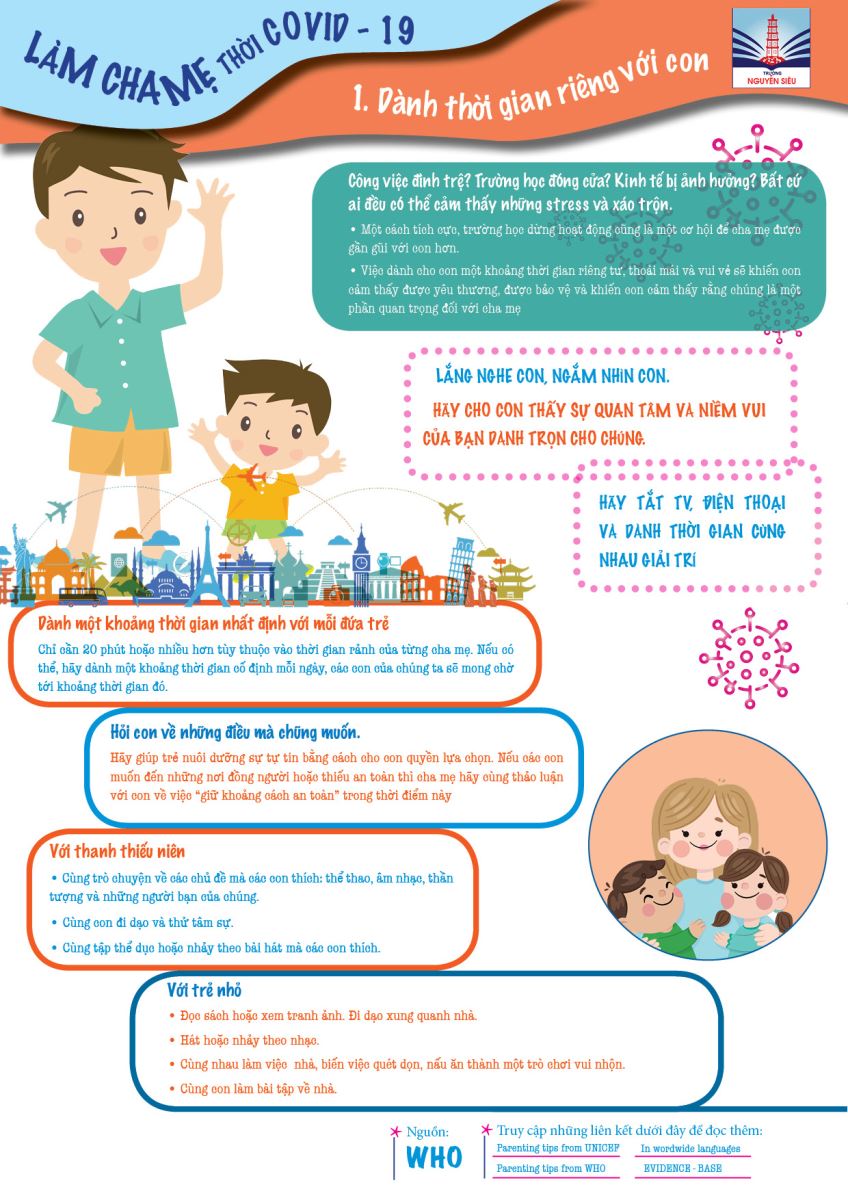 Mời quý cha mẹ học sinh nhấp vào từng chủ đề dưới đây để được dẫn tới bản pdf tiếng Việt do các thầy cô Nguyễn Siêu chọn lược dịch. Ở cuối mỗi trang sẽ có chỉ dẫn hữu ích tới các mẹo hay mà Tổ chức Y tế Thế giới WHO và UNICEF đã nghiên cứu dành cho các gia đình trong mùa dịch này cũng như cơ sở khoa học và thực tiễn của những khuyến cáo được đưa ra.
