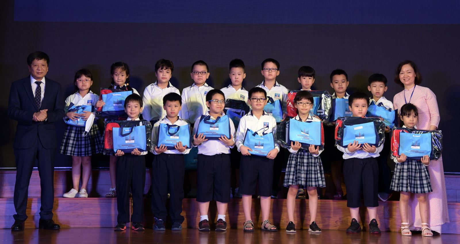 Học sinh Nguyễn Ngọc Minh Anthony (6CI6) nhận Học bổng Nguyễn Siêu từ cô Hiệu trưởng và quà từ cô giáo truyền cảm hứng nhiều nhất cho con. Mẹ của con lên sân khấu tặng hoa thay cho lời cảm ơn cô giáo.