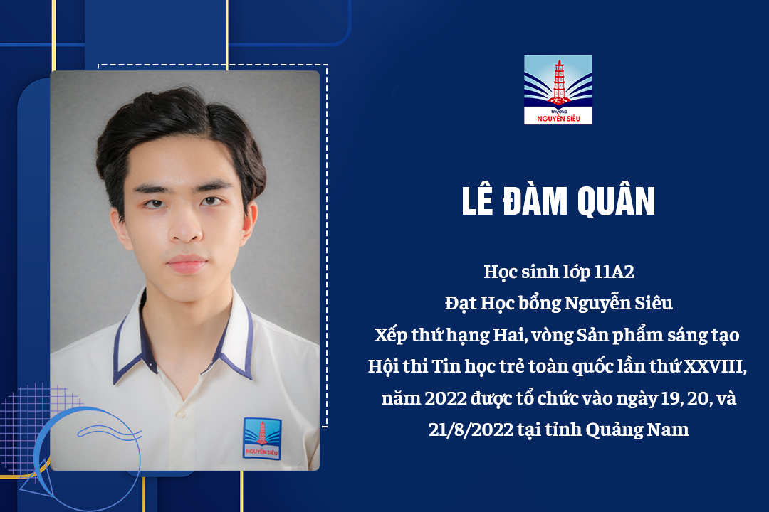 Và Lê Đàm Quân cũng là một học sinh Nguyễn Siêu năng động, sáng tạo. Đến với mái trường Nguyễn Siêu từ năm lớp 6, trưởng thành và gắn bó với thầy cô, bạn bè trong năm năm, Quân để lại nhiều ấn tượng với thầy cô và các bạn. Bạn bè thường gọi Quân là “Đàm”, bởi trong lứa học sinh tài năng sinh năm 2005 của Nguyễn Siêu còn có một nhân vật khá nổi bật khác đó là tay trống Đỗ Đức Quân (lớp 11A1).