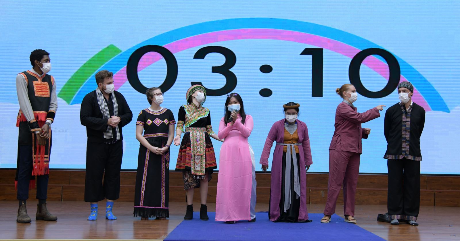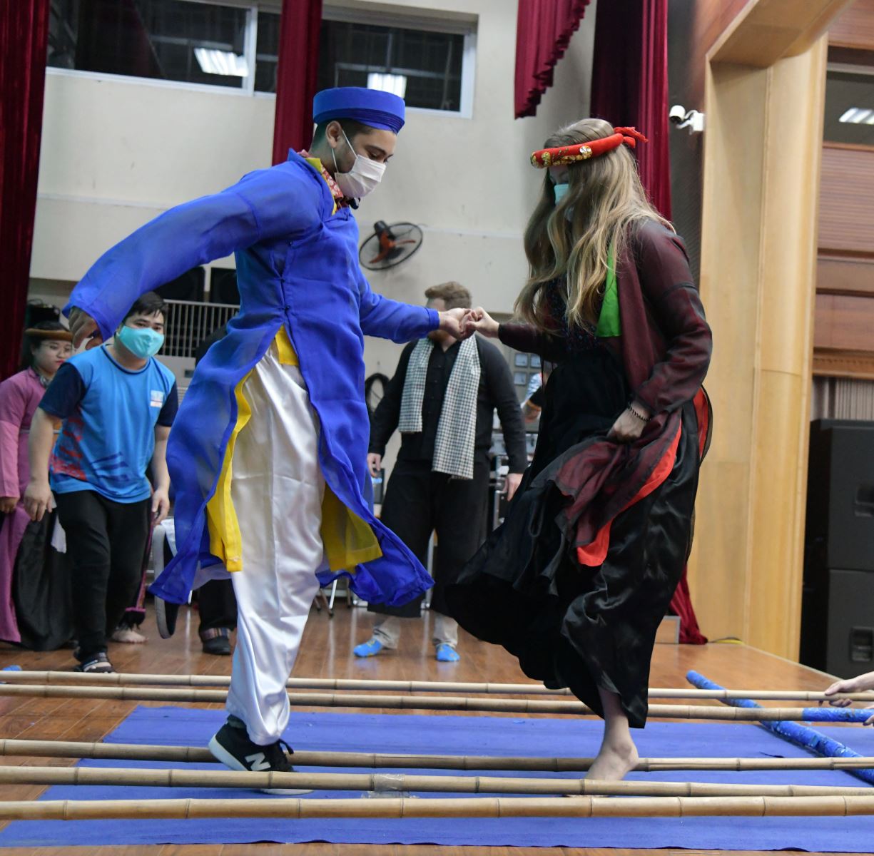 Giáo viên nước ngoài trong trang phục các dân tộc Việt Nam và điệu nhảy sạp truyền thống