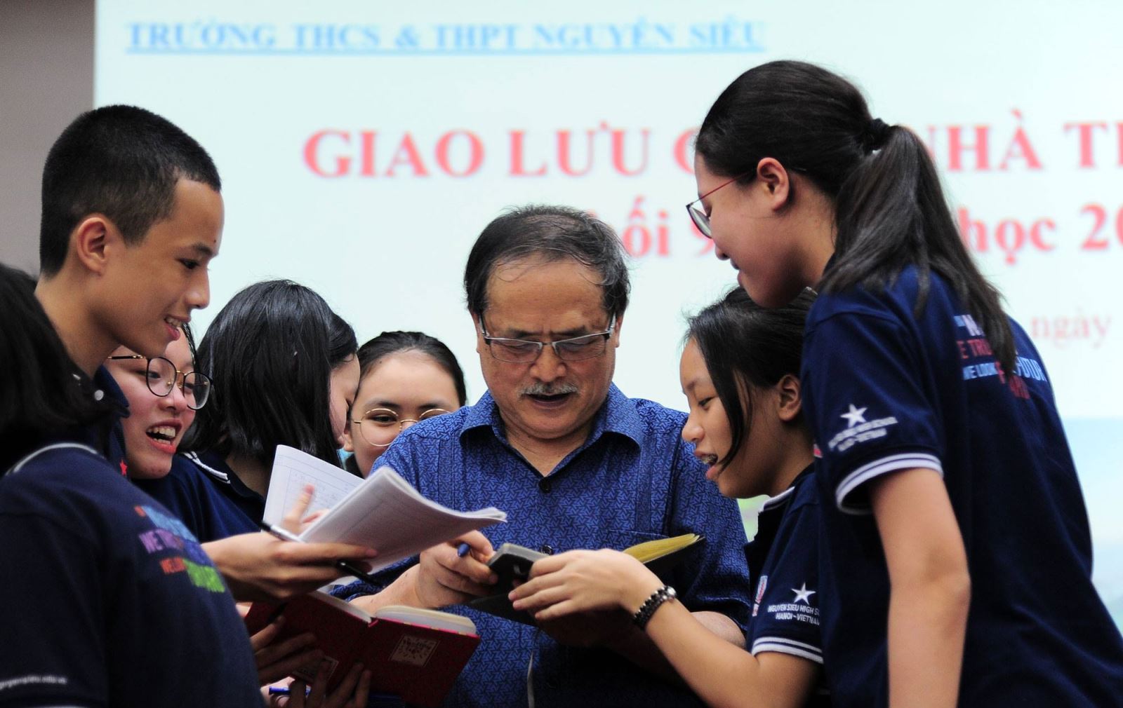 Nhà thơ Y Phương trong một lần trò chuyện, chia sẻ chuyện văn thơ và cuộc đời với giáo viên, học sinh trường Nguyễn Siêu