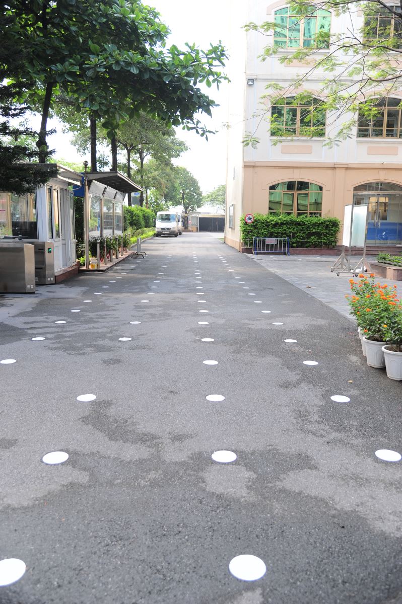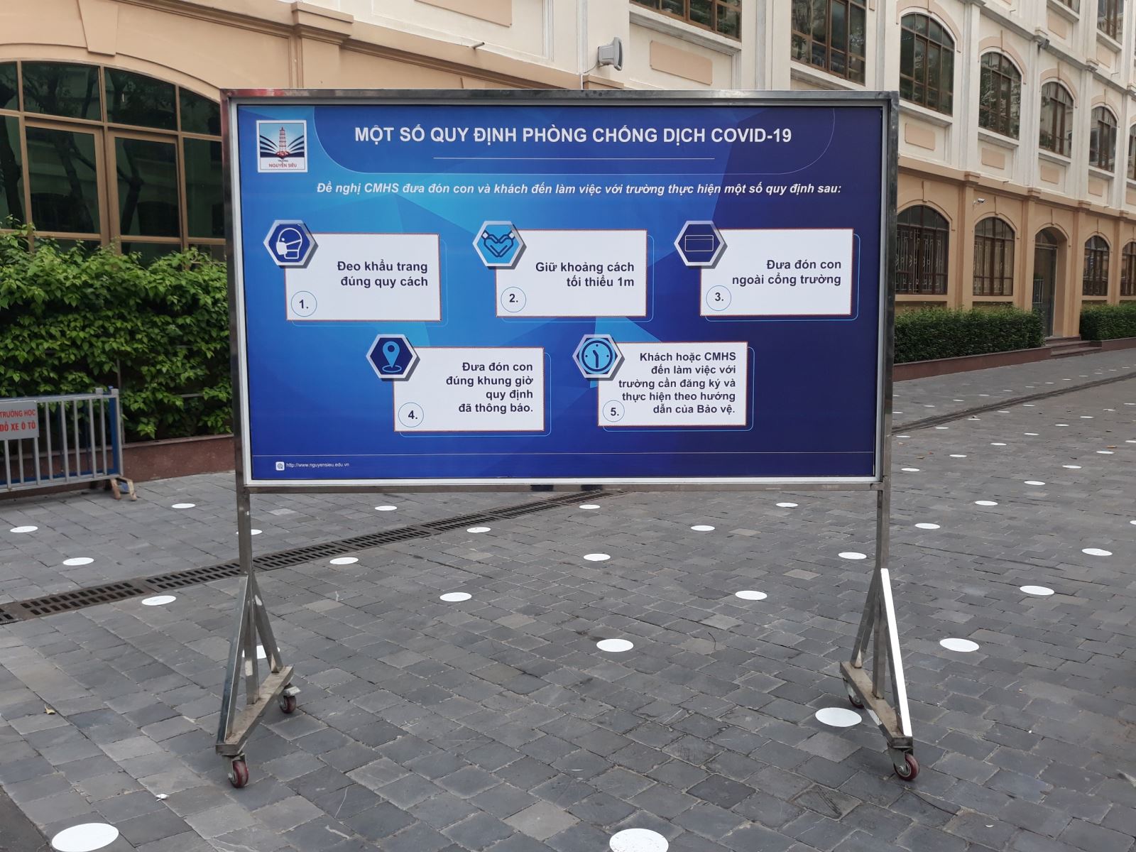 Khuôn viên nhà trường cũng được trang bị đầy đủ trang thiết bị để đảm bảo mọi hoạt động của học sinh được diễn ra thật suôn sẻ. Số lượng bồn rửa tay của học sinh được lắp đặt thêm bồn kèm theo xà phòng diệt khuẩn. Những chấm trắng được dán trên sân trường hướng dẫn chúng ta cách di chuyển và giữ khoảng cách an toàn. Hàng trăm biển báo lớn nhỏ và các poster được dựng và dán ở khắp các khu vực và trong từng lớp học.
