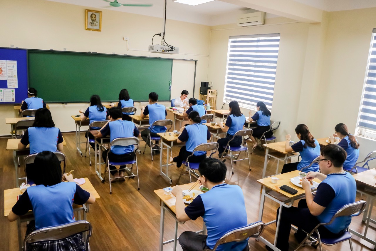 Các thầy cô đóng vai học sinh trong giờ ăn trưa. Học sinh sẽ được sắp xếp vị trí ăn tại lớp, theo suất, thực đơn phù hợp với thực tế trong giai đoạn phòng chống dịch bệnh.