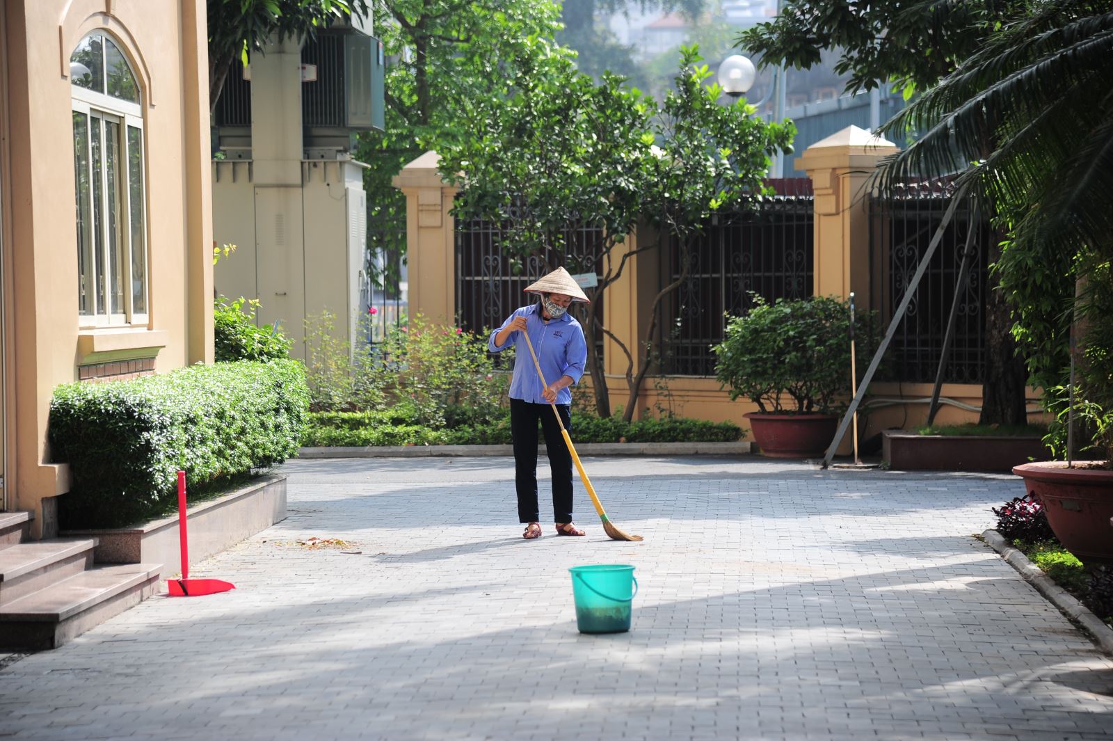Cô lao công giữ cho sân trường sạch đẹp