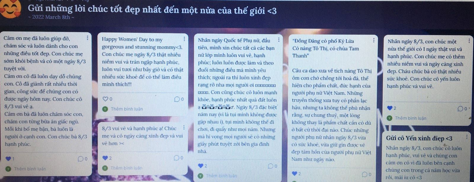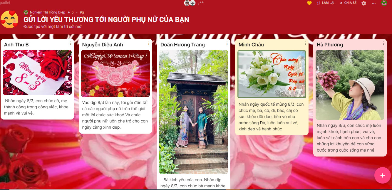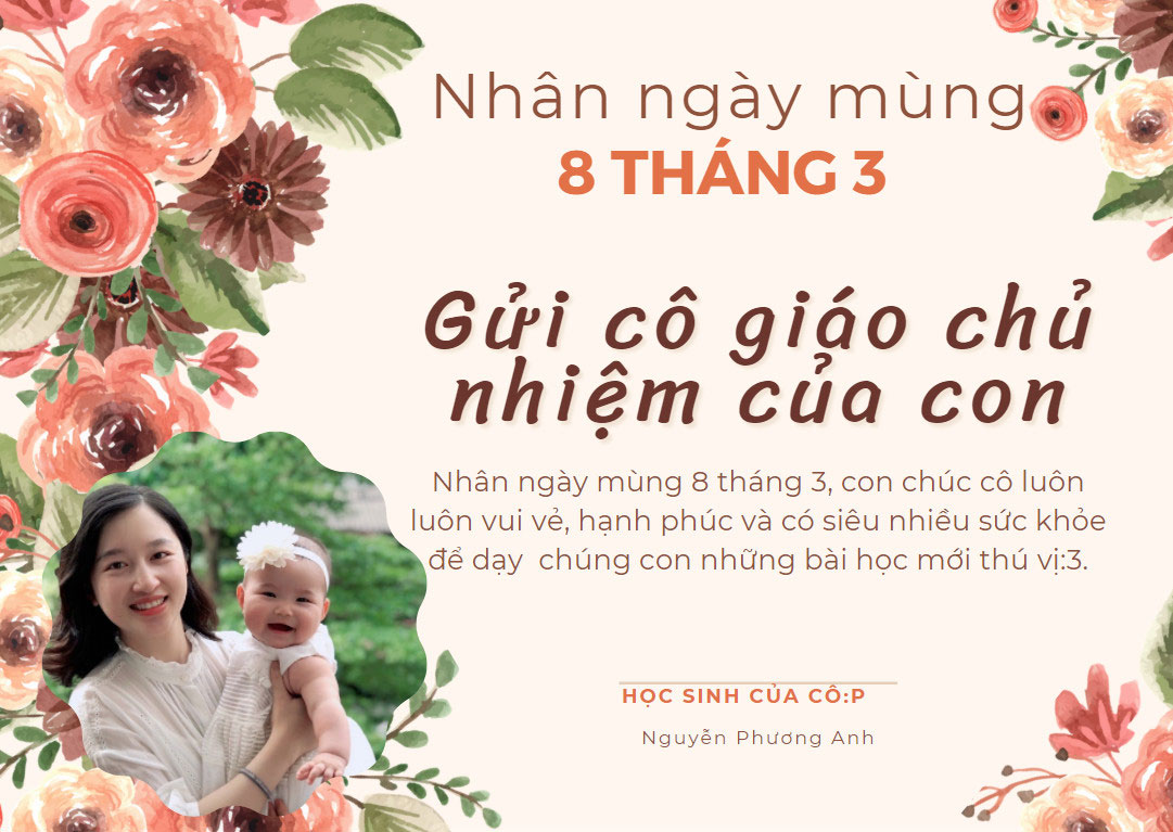 Với riêng mỗi người, ai cũng có cho mình những người phụ nữ đặc biệt, đó là bà, là mẹ, là cô và cũng có thể là một bạn nữ dễ thương nào đó. Bởi thế, nhân dịp này, các bạn học sinh Nguyễn Siêu đã gửi lời chúc, những tấm thiệp tự thiết kế tới những người phụ nữ mà mình yêu quý với ước mong tất cả những người phụ nữ của chúng ta thật bình an và hạnh phúc.